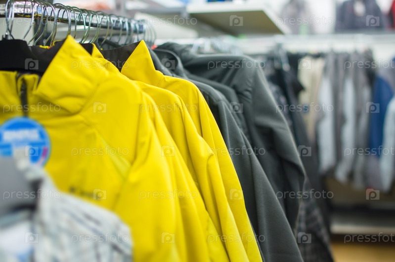 Куртки, жилеты и джемперы на стендах в супермаркете