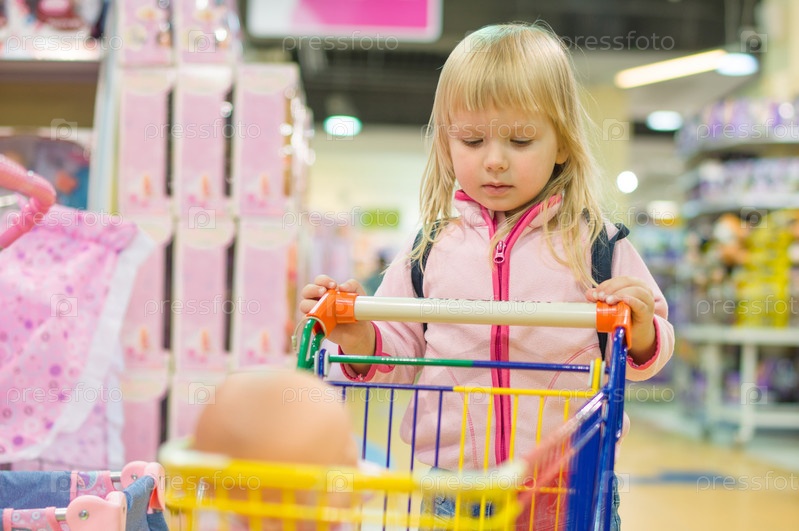 Девочка с небольшой корзиной в детском магазине