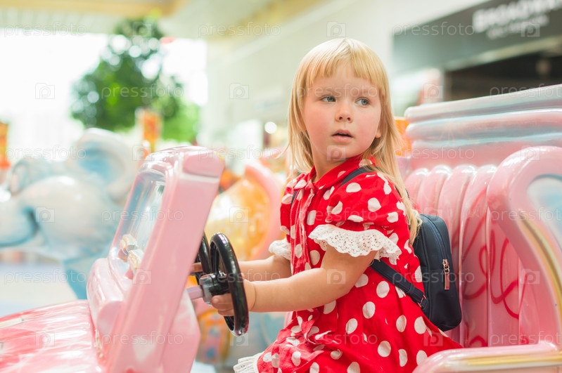 Очаровательный ребенок едет на игрушечном автомобиле в торговом центре