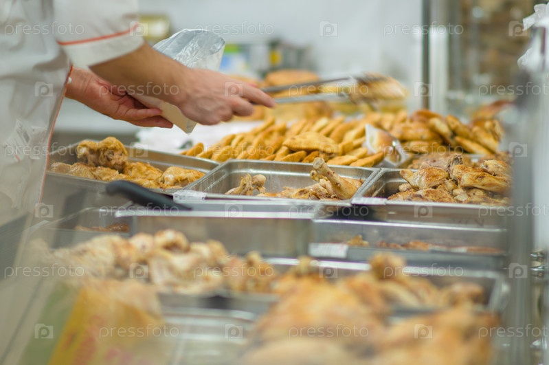 Жареное мясо курицы и выпечка на витрине в супермаркете