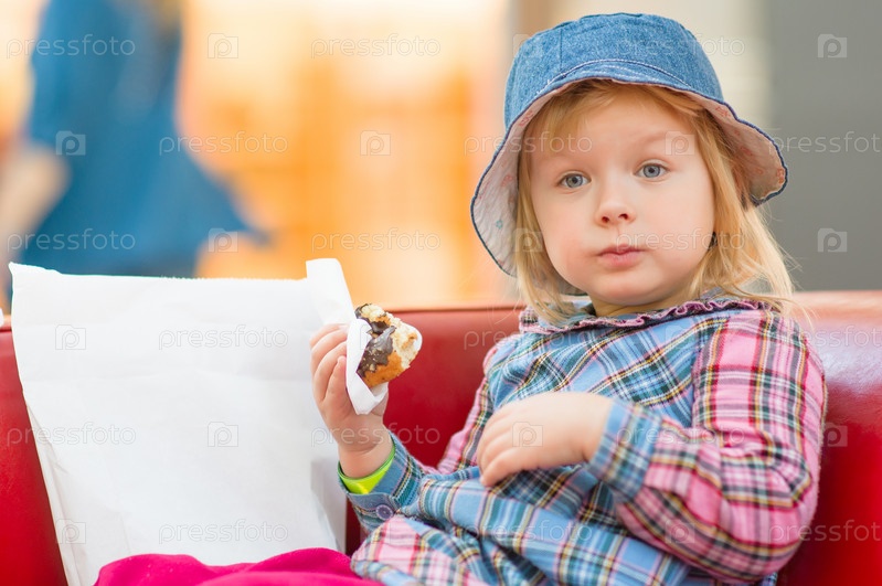 Очаровательная девочка ест пончик с шоколадом в торговом центре