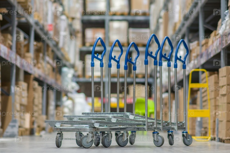 Полки с коробками и тележки на современном складе