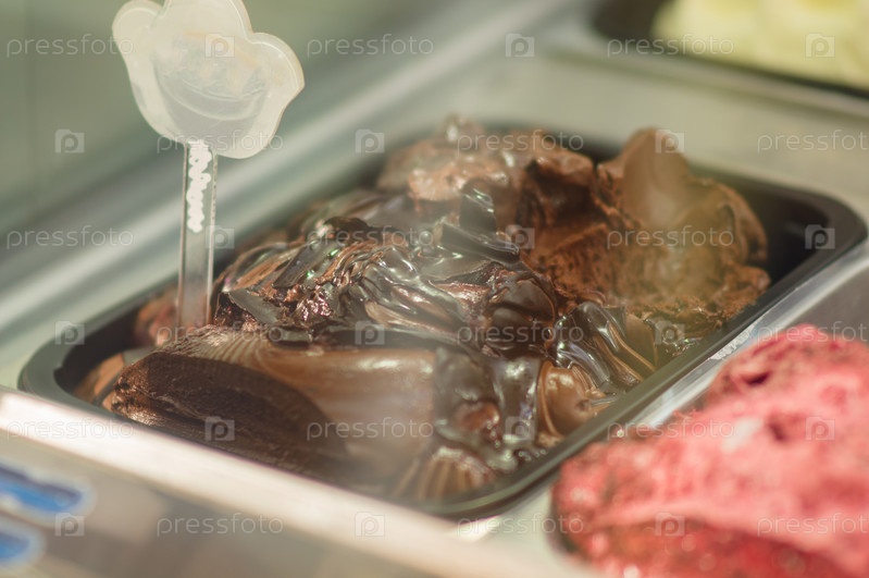 Вкусное шоколадное мороженое в витрине