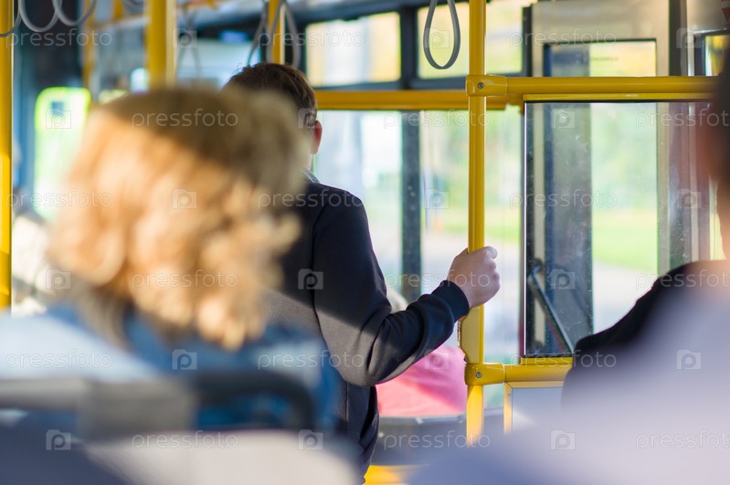 Пассажиры готовятся к выходу из современного автобуса