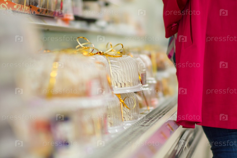 Свежие торты на полках в супермаркете