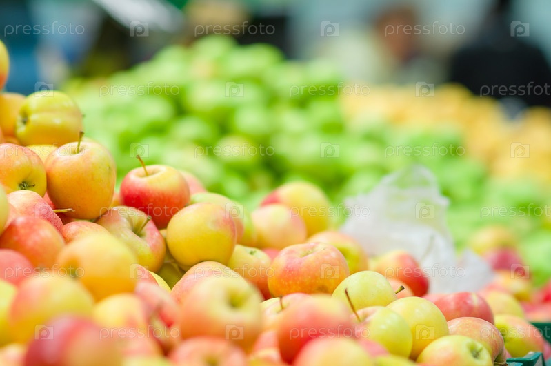 Свежие яблоки в ящиках в супермаркете