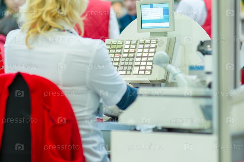 Кассир на кассе с терминалом в супермаркете