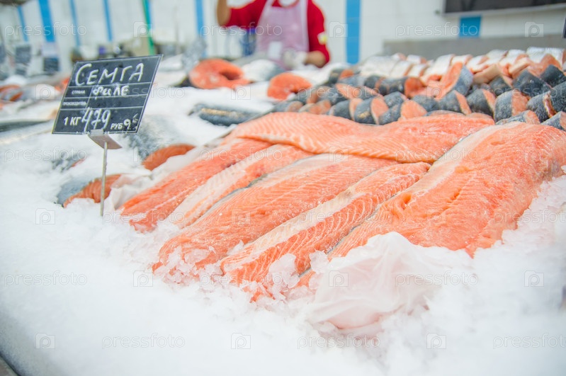 Атлантический лосось на витрине со льдом в супермаркете