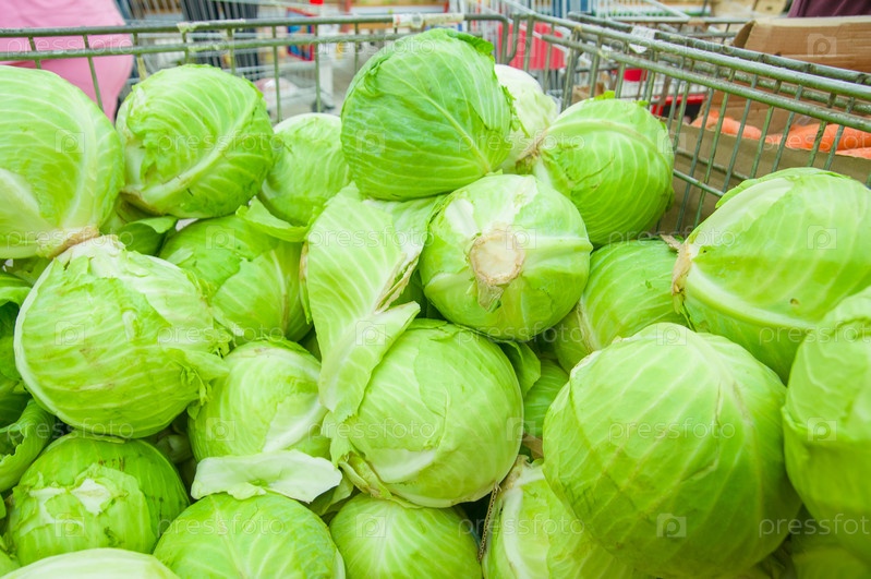 Свежая зеленая капуста в металлической коробке в супермаркете