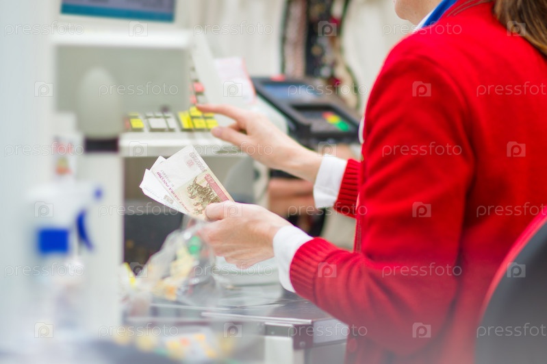 Кассир на кассе с терминалом обслуживает клиентов, держа в руке деньги, в супермаркете