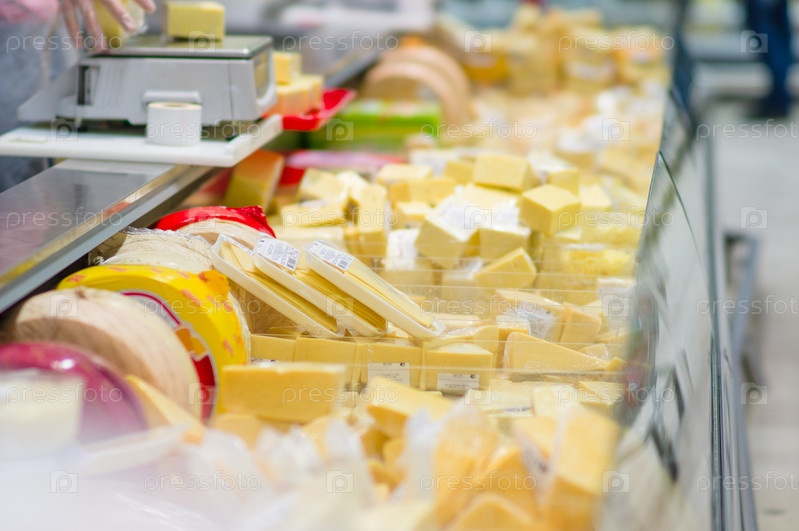 Кусочки различных сыров в холодильнике в супермаркете