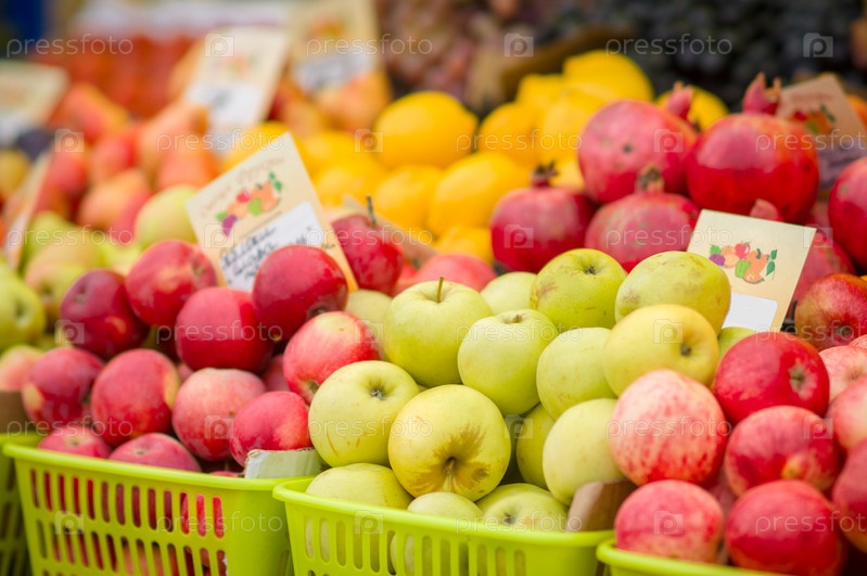 Красные и зеленые яблоки и фрукты на городском рынке