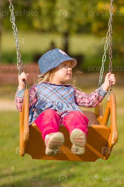 Очаровательная девочка в платье и шапочке на качели на площадке в парке