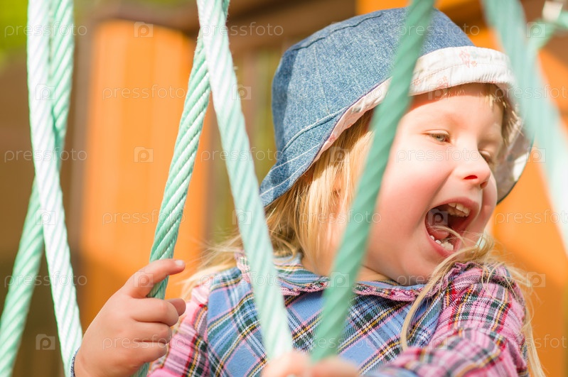 Очаровательная девочка в платье и шапочке поднимается на сооружение на площадке
