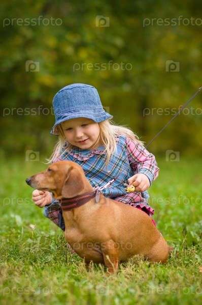 Очаровательная девочка сидит рядом с таксой на траве в парке