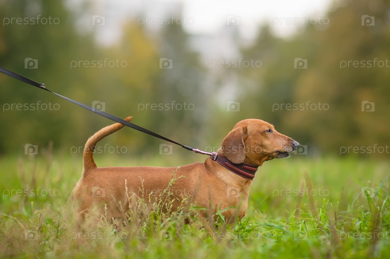 Такса с ошейником и поводком на траве в парке