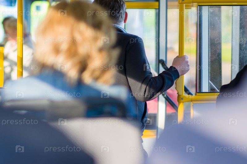 Пассажиры готовятся на выход в интерьере современного автобуса