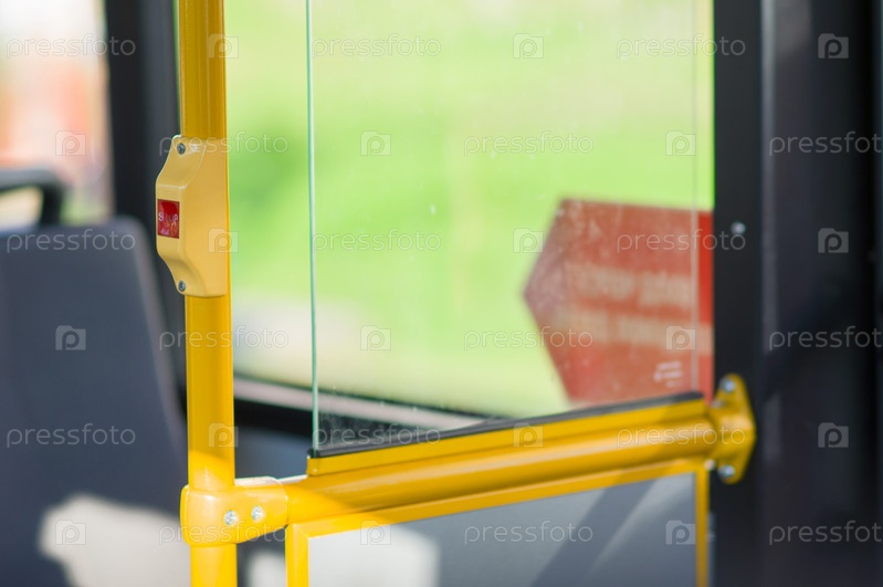 Интерьер современного городского автобуса с кнопкой предупреждения об остановке