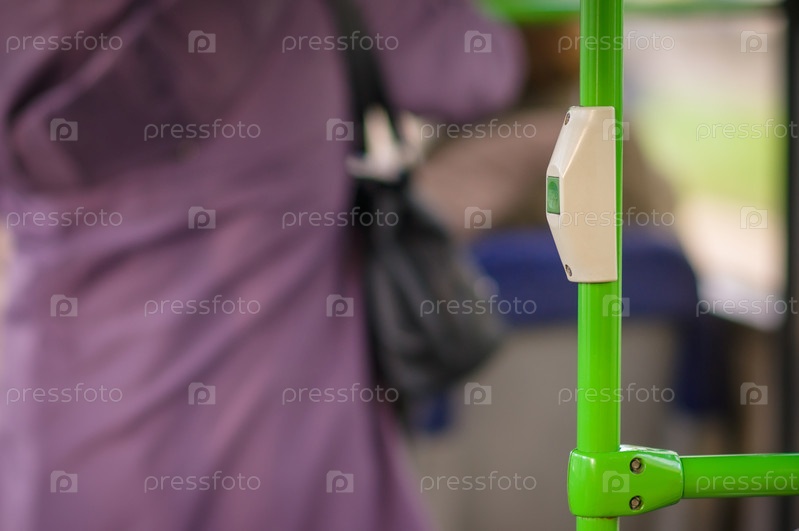 Интерьер современного городского автобуса с кнопкой предупреждения об остановке