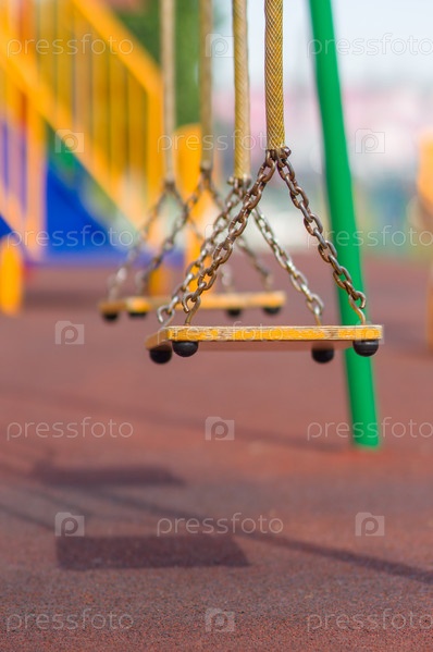 Пустые качели на летней детской площадке