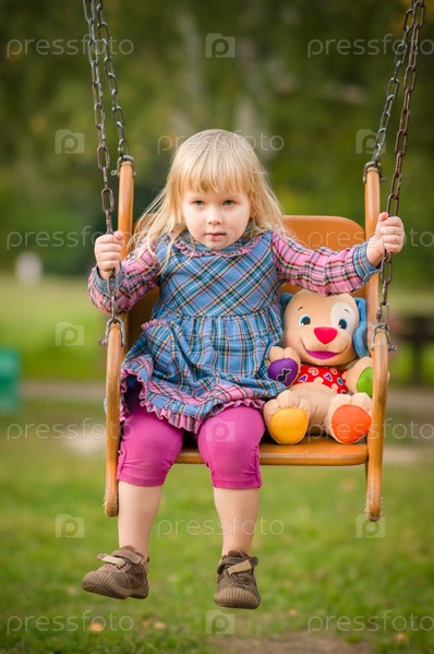 Очаровательная девочка с плюшевой игрушкой катается на качели на площадке в парке