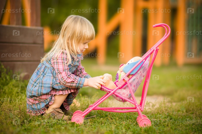 Очаровательная девочка в платье катает куклу в игрушечной коляске на площадке