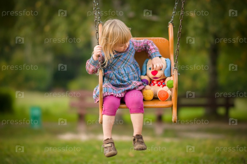 Очаровательная девочка с плюшевой игрушкой катается на качели на площадке в парке