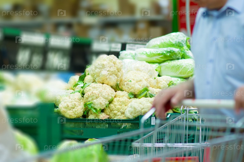 Капуста в пластиковых ящиках в супермаркете