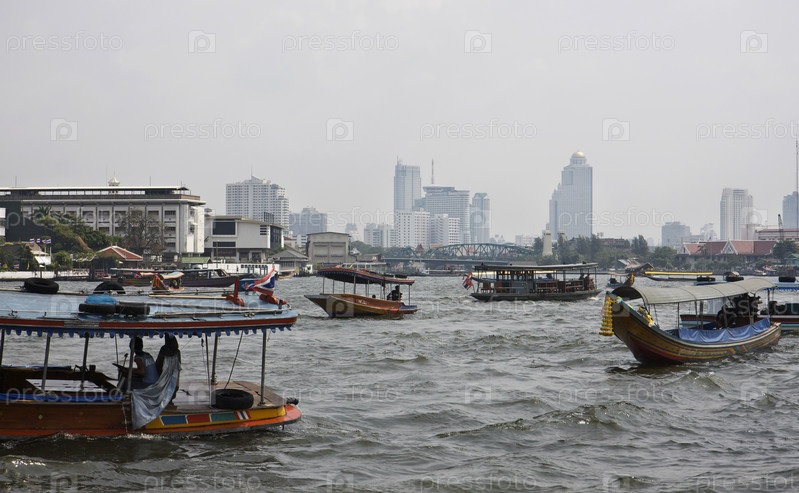 Таиланд, Бангкок. Река Чао Прая с лодками и Имперский город на заднем плане