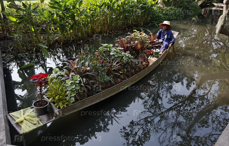 Таиланд, Бангкок, Розовый сад, тайский садовник везет тропические растения в лодке