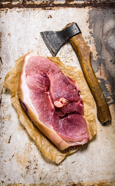 Большой кусок сырой свинины с топором