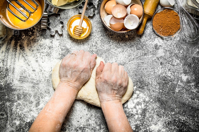 Женщина месит тесто с различными ингредиентами на столе