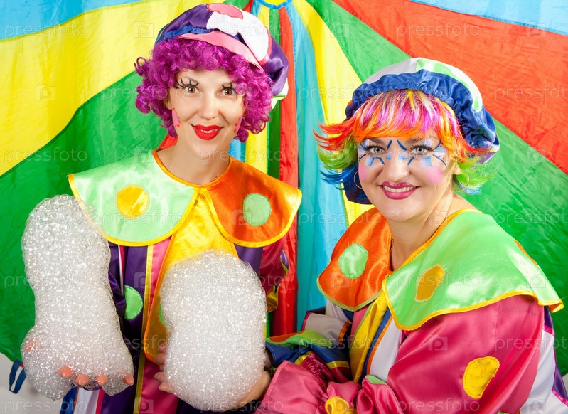 Клоуны с мыльными пузырями на красочном фоне