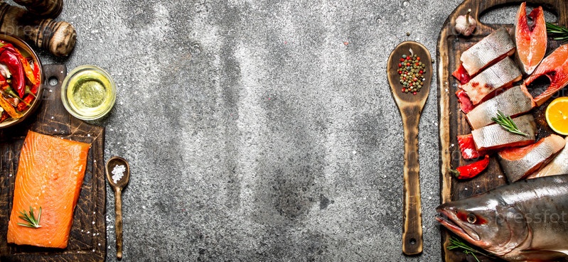 Кусочки нарезанного филе лосося на деревенском столе