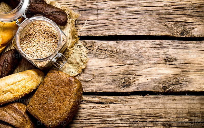 Свежий хлеб с зернами пшеницы на деревянном столе