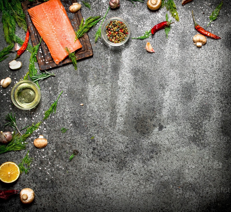 Филе лосося с травами и специями на деревенском фоне