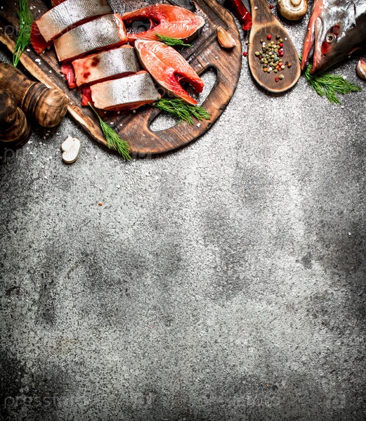 Кусок свежего лосося со специями на старой разделочной доске