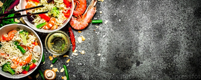 Азиатская еда. Китайская лапша с овощами и креветками