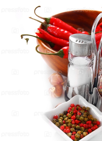 Соль, перец и чеснок на белом фоне