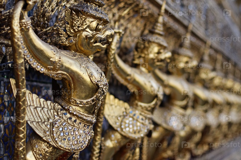 Золотые статуи на внешней стене храма Буддиста, Тайланд