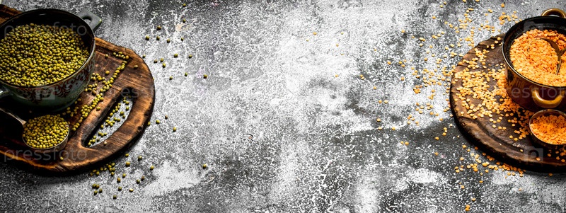 Семена чечевицы и зеленые бобы в мисках