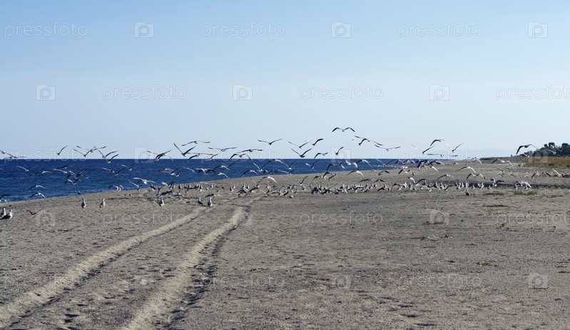 Побережье Италии, Калабрия, Ионическое море. Чайки на пляже, недалеко от Реджо-Калабрия