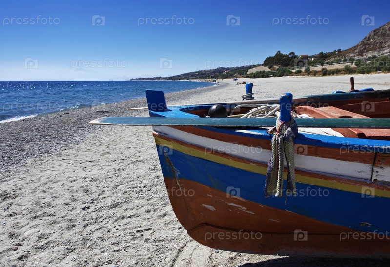 Италия, Калабрия, Ионическое море. Рыбацкая лодка на пляже рядом с Реджо-Калабрия на фоне сицилийского вулкана Этна