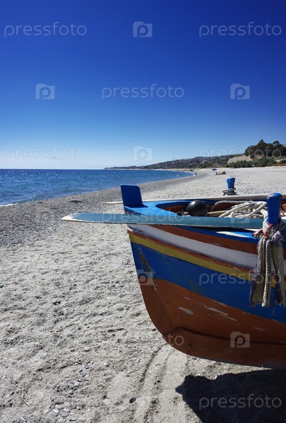 Италия, Калабрия, Ионическое море. Рыбацкая лодка на пляже рядом с Реджо-Калабрия на фоне сицилийского вулкана Этна