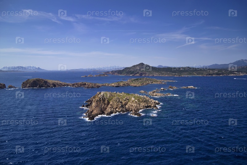 Италия, Сардиния, провинции Ольбия, Аэрофотоснимок Изумрудного побережья и Тирренское море