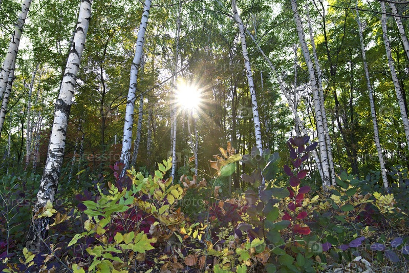 Луг в березовом лесу осенью в солнечном свете