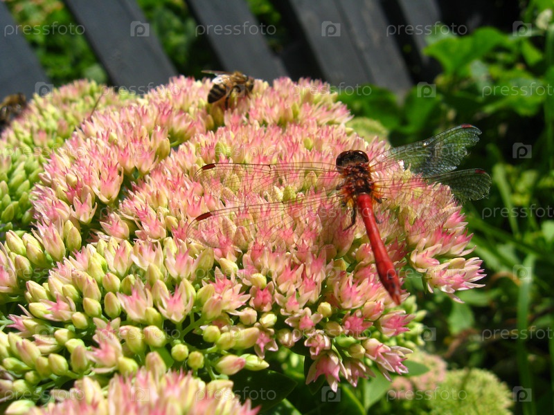 Стрекоза и пчела на цветах