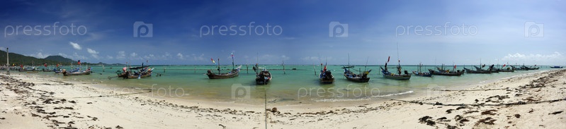 Таиланд, остров Кох Самуи, местные рыбацкие лодки на берегу. Панорама