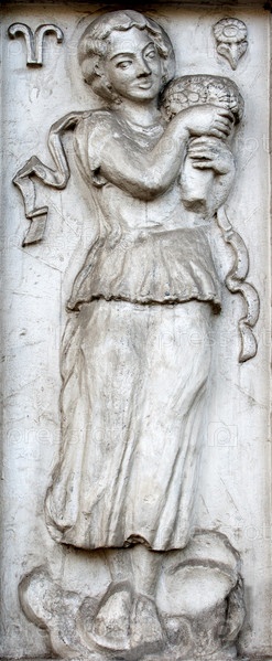 Старый барельеф с женщиной, держащей букет цветов, на стене