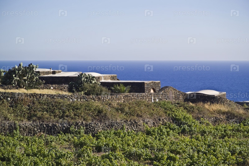 Италия, Сицилия, остров Пантеллерия, виноградники, опунции и крыша типичного местного каменного дома в арабском стиле